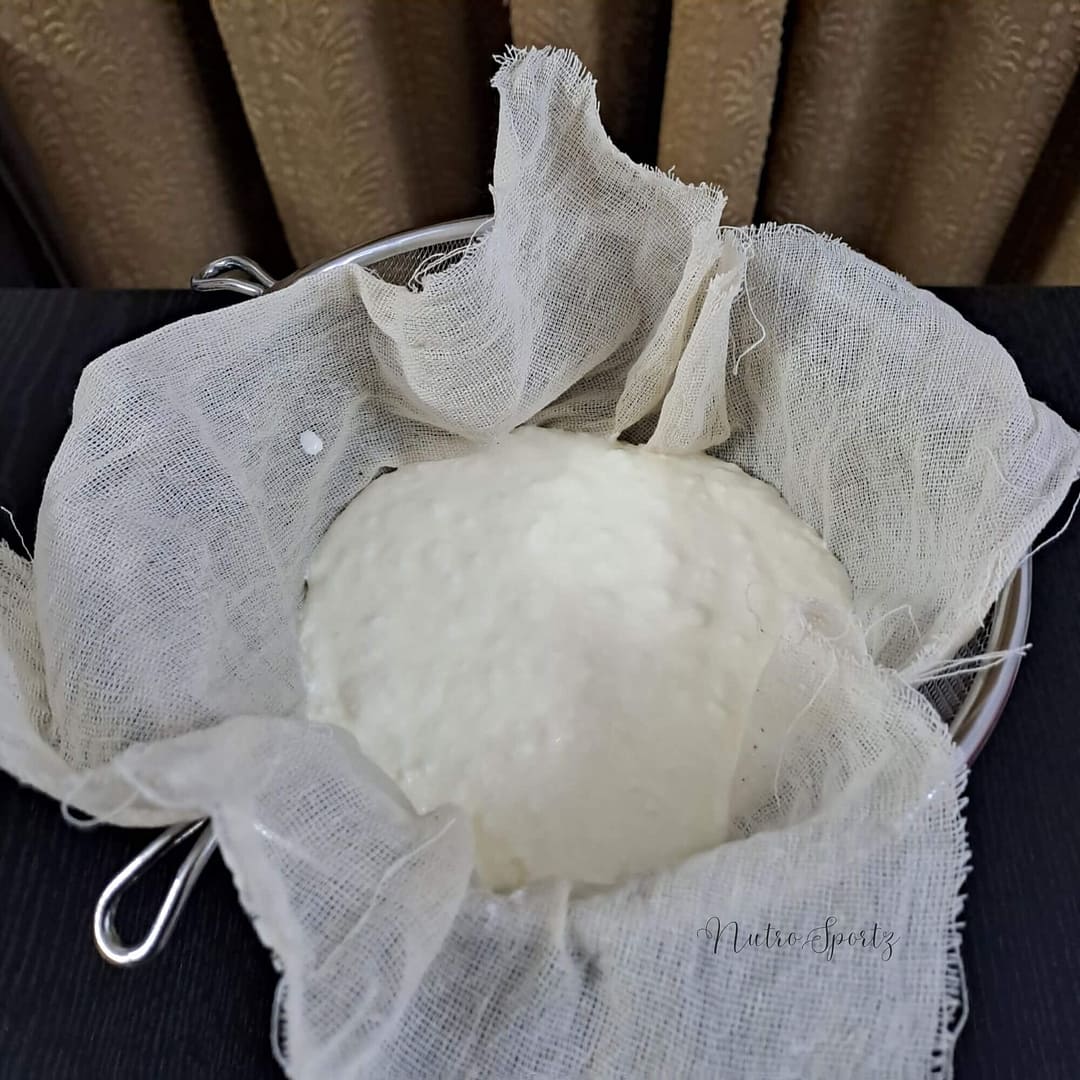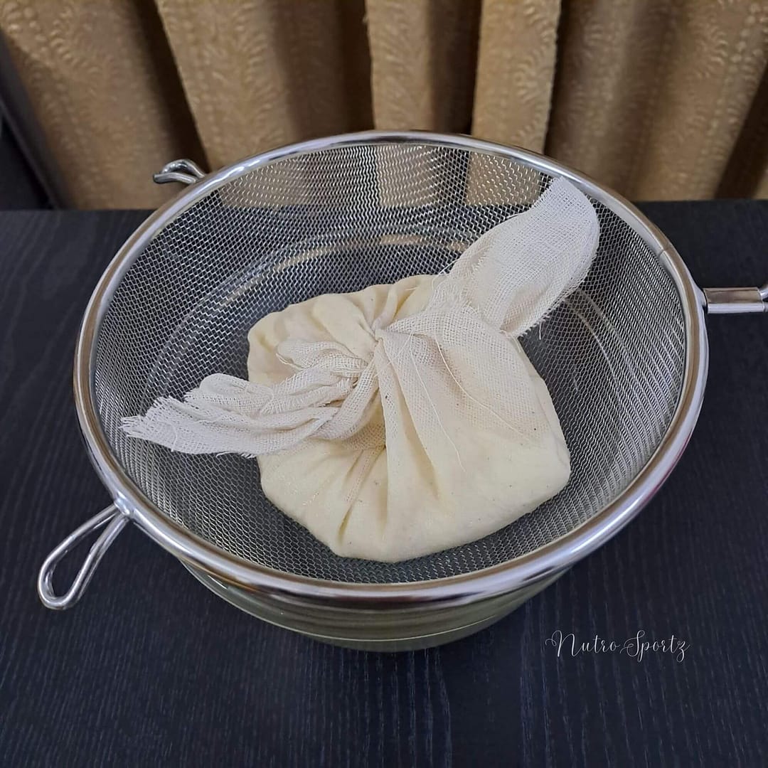 - Refrigerate the setup (bowl with strainer and cloth) overnight to allow the whey (liquid) to drain out.