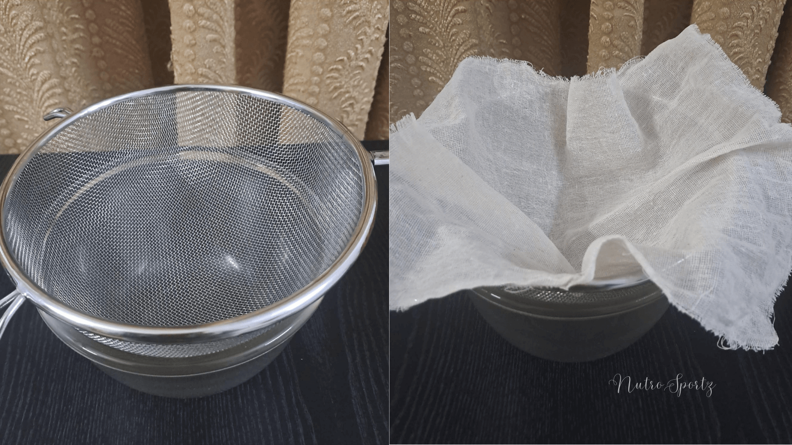 - Place a fine strainer over a deep bowl and line it with clean muslin or cheesecloth.